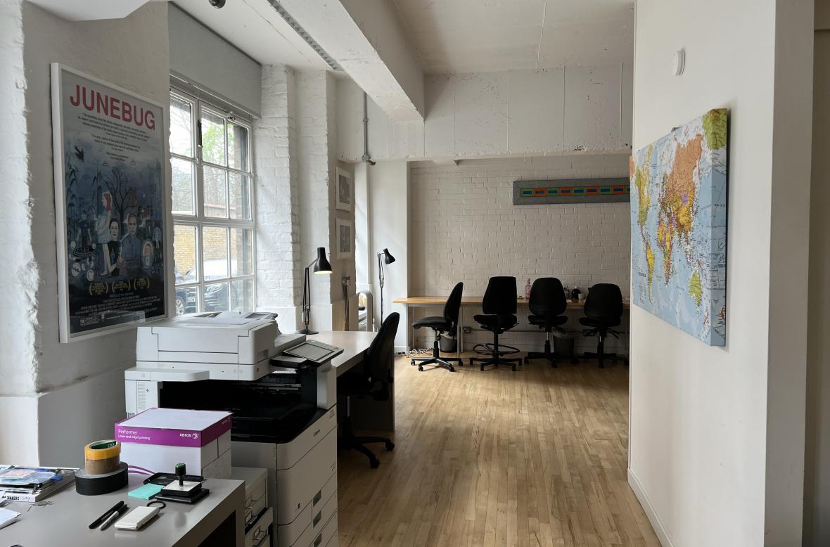 Our office is ground floor with direct access through one main entrance - There is no through traffic going to other offices so it’s completely self contained. Three very large windows run down the whole of the street facing wall and the office is often flooded with light. In the evening steel shutters cover the windows and the entrance doorway so it is completely secure and offers no ‘view’ to the interior once the office is closed.