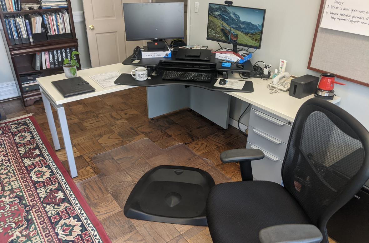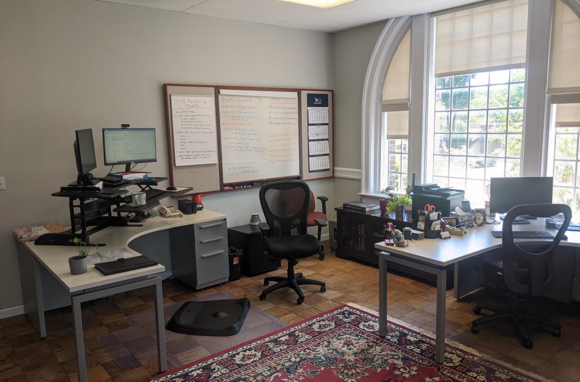 The office space itself is on the second floor and features two desks, one of which is availabe, a white board, Verizon FiOS business internet connection (300 Mbps down/up), an HP Color LaserJet printer, and a small fridge. The desk that is available has an ergonomic, thermarest chair that is fully adjustable. The pictured standing desk conversion can be left in place if desired, or removed.